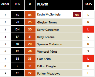 Top prospect Kevin McGonigle is making a statement this Spring. He needs to be starting at shortstop on Opening Day for the Tigers. In fact, Roster Resource has slotted him in this role and batting lead off!