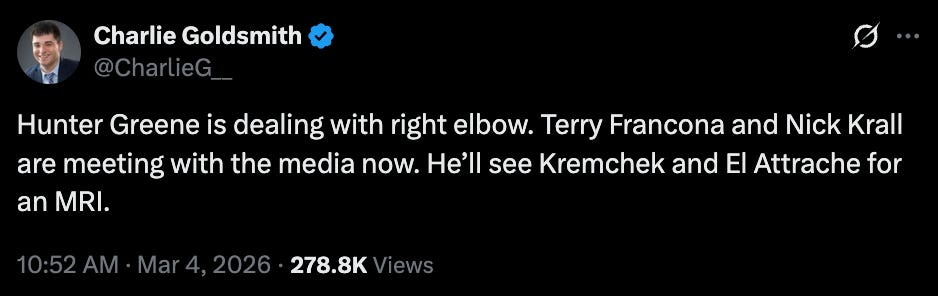According to Charlie Goldsmith, Greene is dealing with a right elbow.