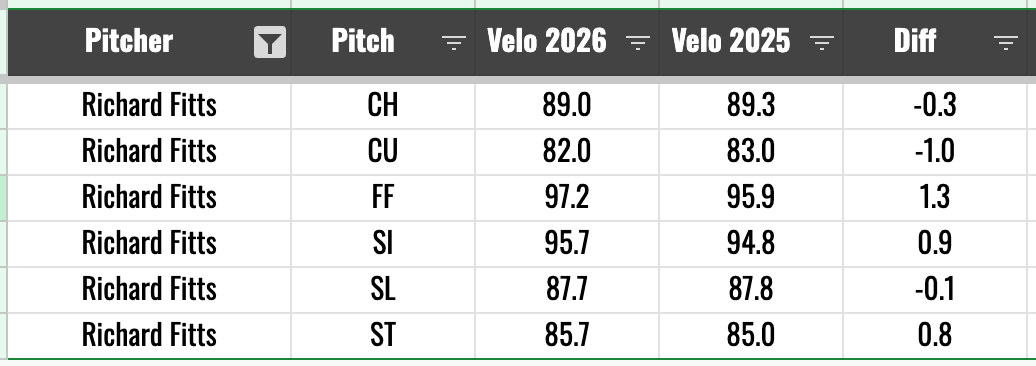Dicky Fitts was tied for the lead in whiffs yesterday. He did face a pretty weak Nicaragua lineup, but he still put up some good stuff. Getting whiffs on his sinker, slider, four-seam, and sweeper. An interesting tidbit: Fitts has gained 2 mph on his sinker, fastball, and slider.