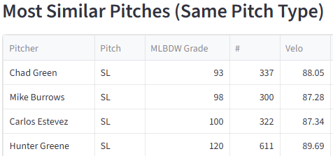 The fastball stat line is slightly concerning, but that slider line. A 62.5% SwStr%!!! Let’s see how that pitch comps to others in the league.