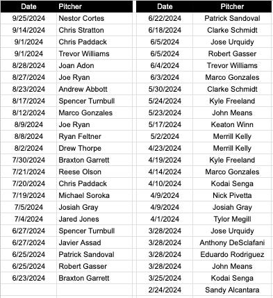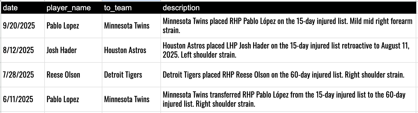 I looked for volume pitchers (starters or long relievers) that had some strain issues in one way or another in 2024. I’ll give you the full dataset at the end of this if you want to do further investigation on it. Here’s the list I narrowed down along with the date where the strain was reported: