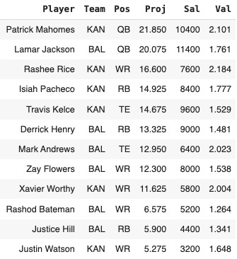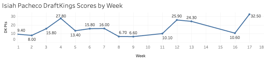 Derrick Henry ($9,000) is more expensive than Pacheco and projects worse. He averaged just 2.1 targets per game last year (and just 13 reception yards), and that will likely come down in Baltimore in this offensive units that has more weapons than Tennessee did last year. His yards per carry also dropped down to 4.2, a career-worst, so the age is a factor.