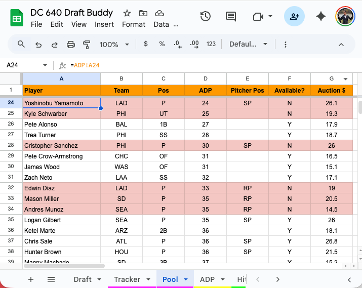 So I’ve put my draft results so far into the Draft tab, and that turns the unavailable player rows red.