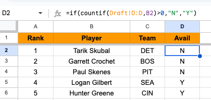 That looks at column D on the Draft tab, and it counts up how many times it finds the value (player name) from B2 on the same sheet you’re typing in. If a player is drafted, it returns a 1. If not, it returns a zero.