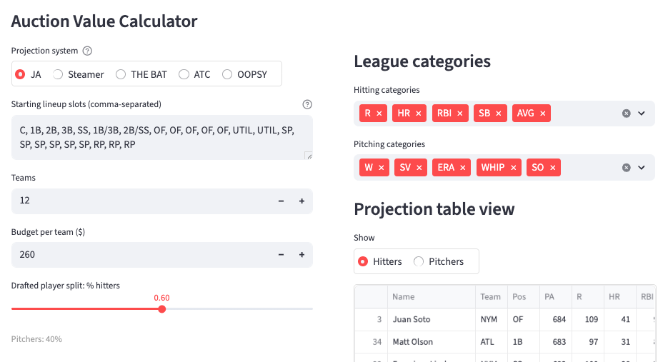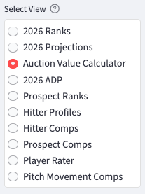 I used a 15-team standard roto league setup (2 C, 5 OF, 1 UTIL) as the default. But what you can do is use the auction value on the web app to replace these values. The step by step of that: