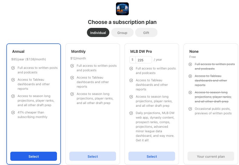 Updates for paid subs! First, I wanted to remind everybody about MLB PRO. Since we’re trying to go to the next level this year, the daily projections stuff (best used for DFS & betting) will be restricted to a higher level of subscribers this year.