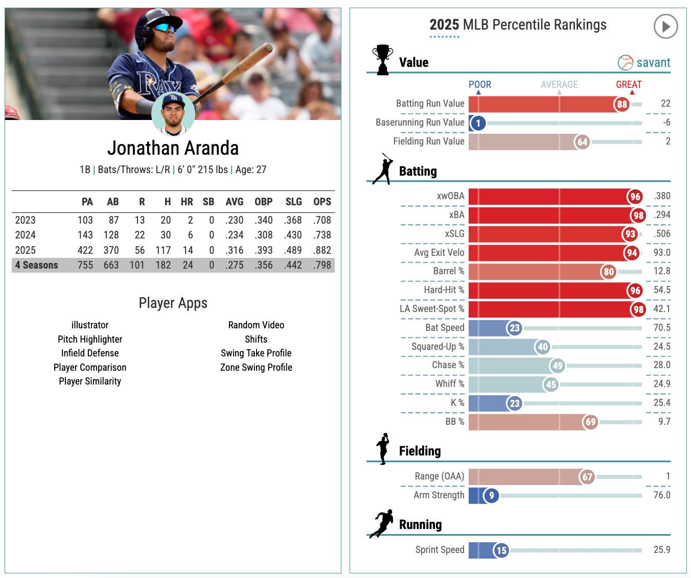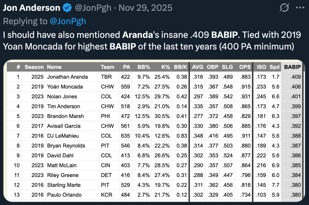 The king of line drives! I really don’t think Aranda will hit many homers next year (going back to the Trop), and he’s the most primed for batting average regression hitter in the league.