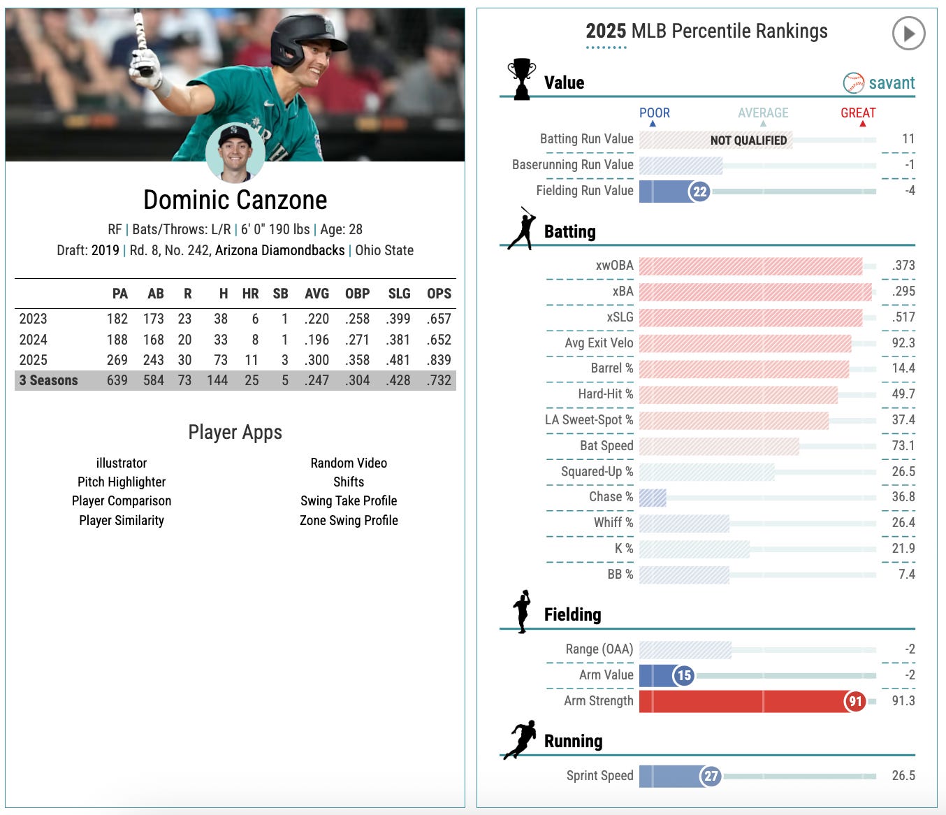 Canzone probably isn’t going to play every day for the M’s. He’s a defensive liability and doesn’t handle left-handed pitching very well. They’ve also recently signed platoon specialist Rob Refsnyder, who will be in there every day against lefties. So you’re looking at 120-130 starts for Canzone. But when he’s in there, you want him in your fantasy lineups, because all he does is mash.