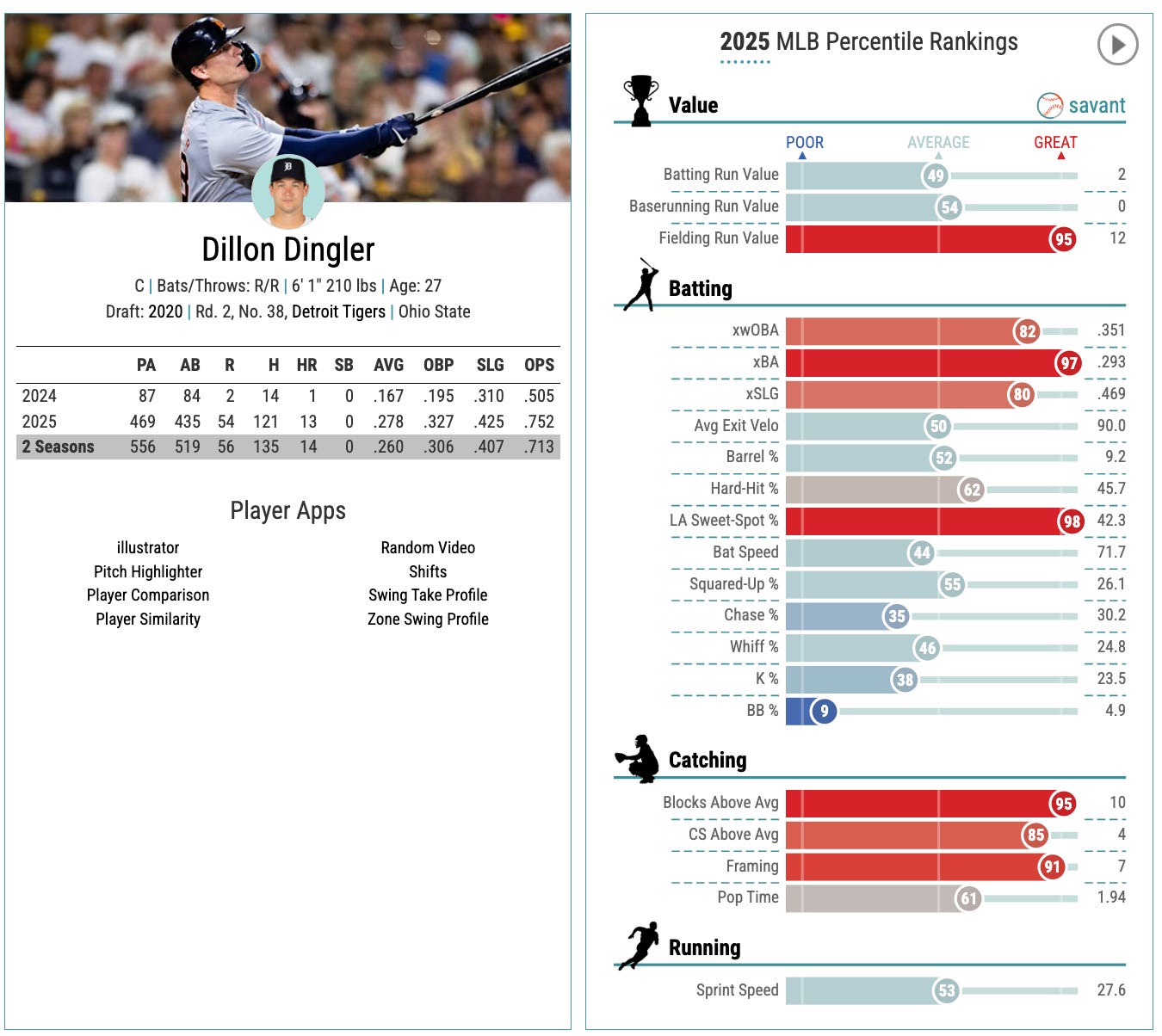 Dingler may be one of the most underrated catchers in the game. He took over for Jake Rogers last year and was great with the bat. By OPS, he was the Tigers’ fourth-best hitter. By xwOBA, he was their #2. By xBA, he was their best.