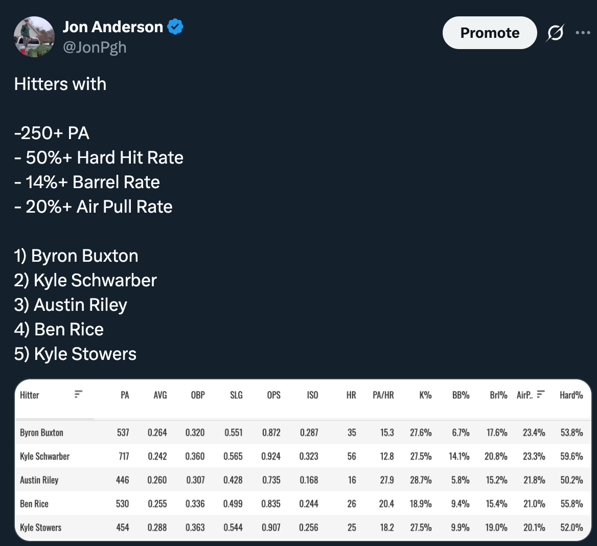 He was in elite company with all of the metrics you like to look at to predict home runs: