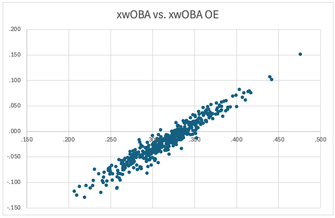 Truth being told, once you get to a certain sample size, xwOBA and xwOBA OE basically line up evenly.