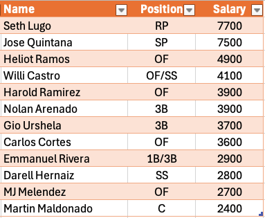 I’m building ten lineups, so that’s 20 SPs to pick. I think I’ll play a good bit of Lugo. And I could use Quintana a time or two, but we’ll see. He is on an MLB team and just getting ramped up, so maybe there will be a pitch count limit here, which could be pretty low. But it’s Quintana, and he’s on the Rockies, so he might actually be looking at this as the biggest game of his 2026 year.