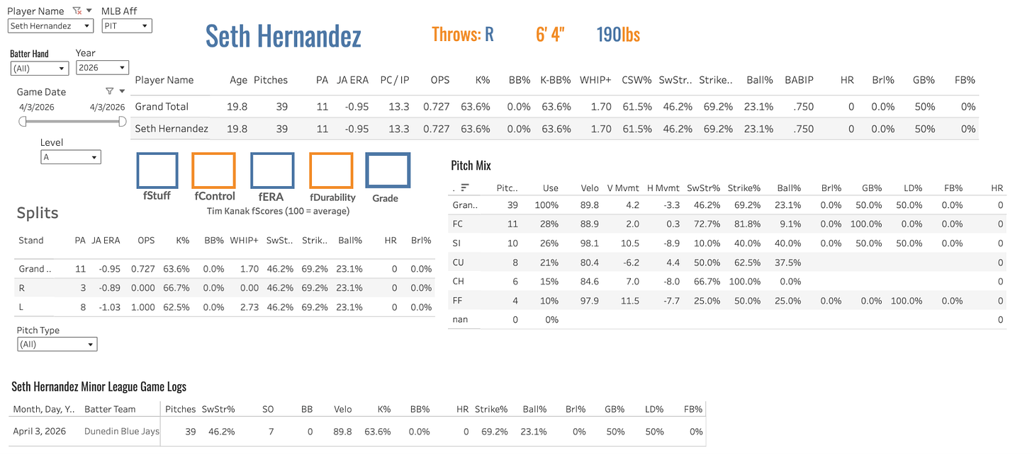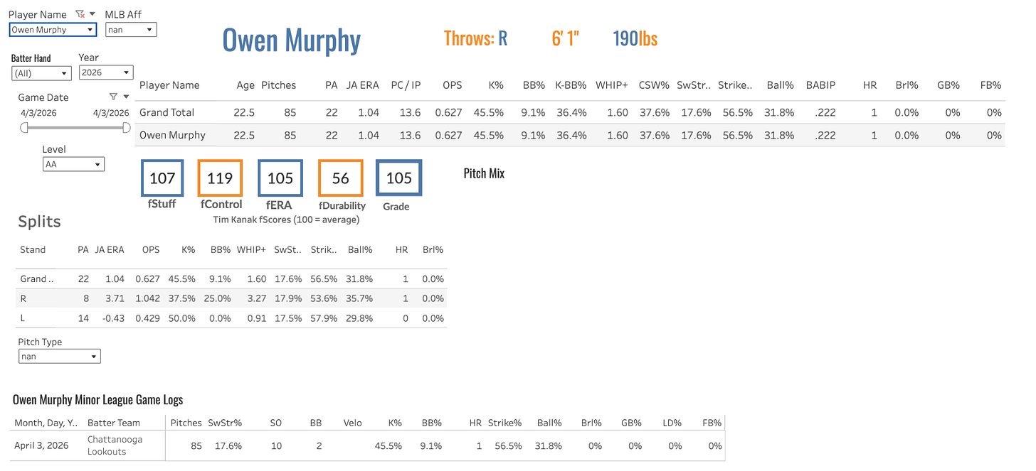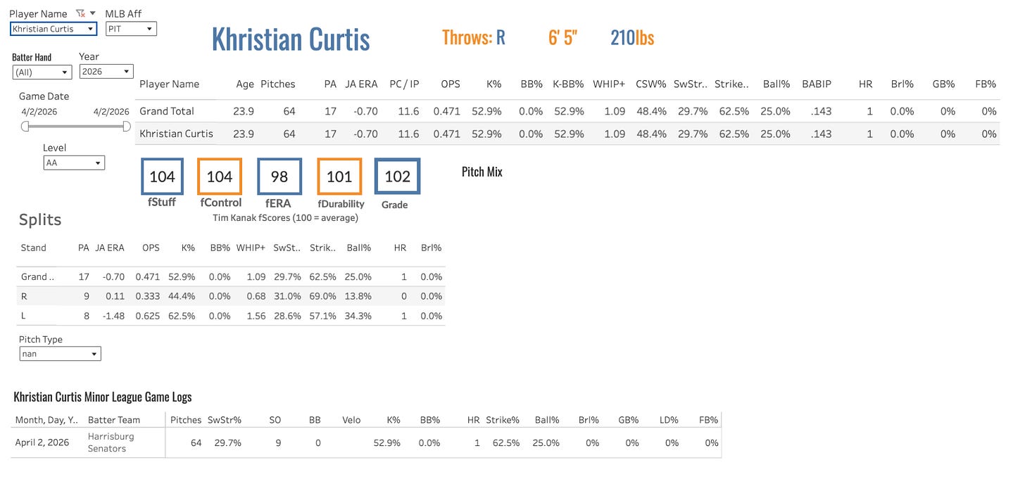 We have put together 2025 and 2026 minor league data (including Statcast stuff in some cases) into one dashboard for quick prospect comparison. The link has been added to the Resource Glossary, and you’ll find it in this post after the paywall.