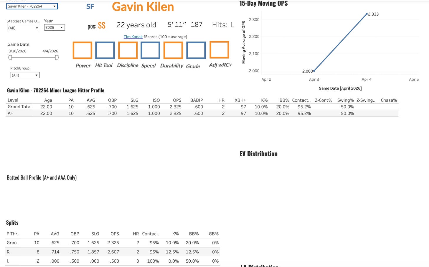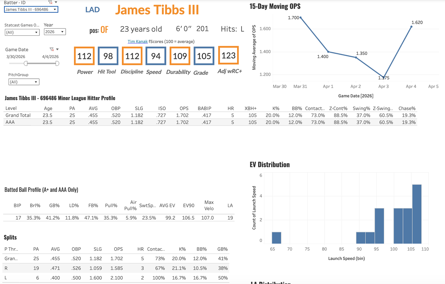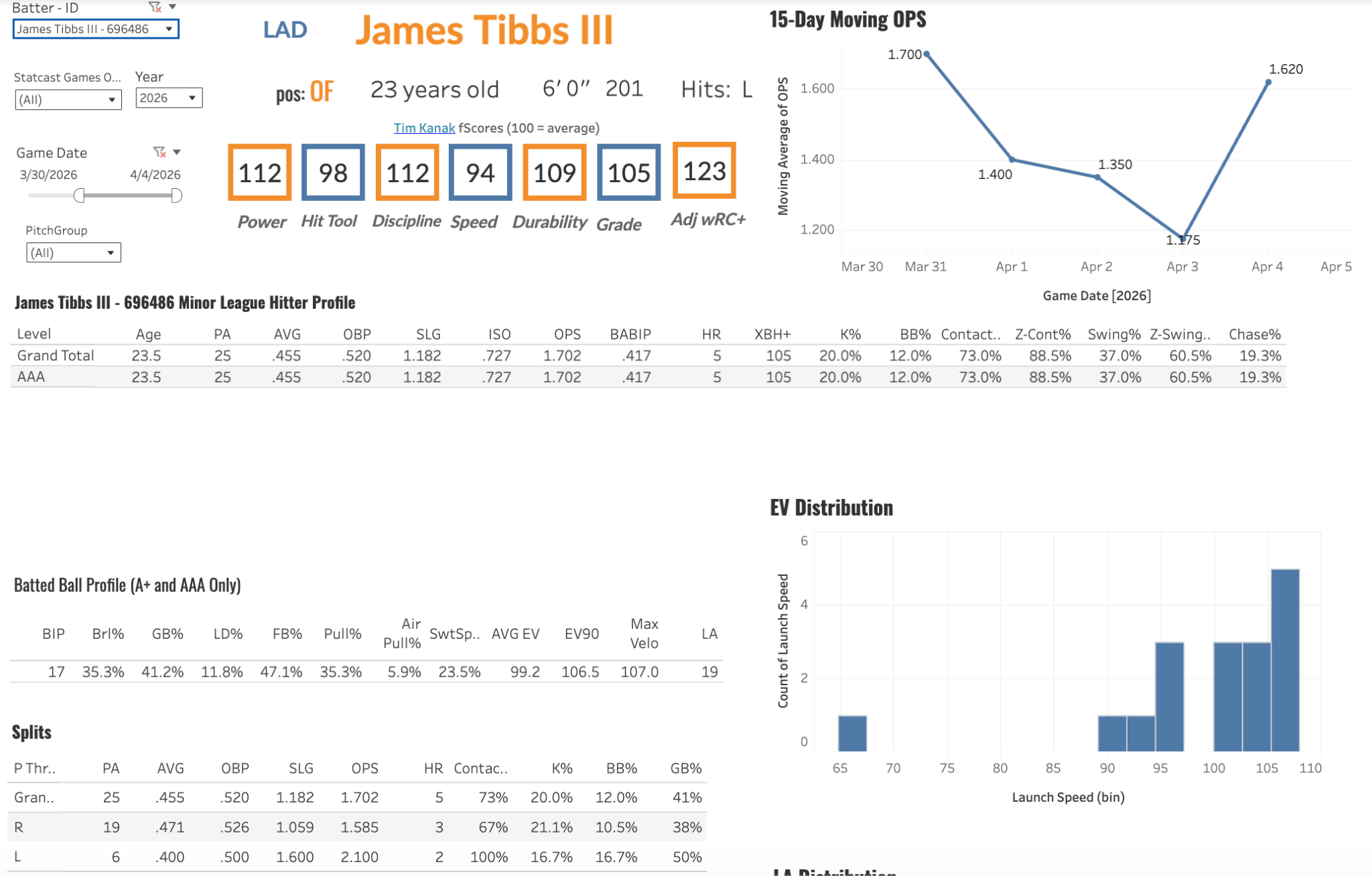 Prime Skills / Player Notes: Tibbs has shown ridiculous power this year with seven bombs already and is not a huge dude, but does show solid power with mid 20s power potential and has above average plate skills with a slightly below average hit tool. He’s been good against lefties so I think he’s a big league corner OF as long as he can keep hitting lefties like he has so far in 2026, but when will the Dodgers have room for him?