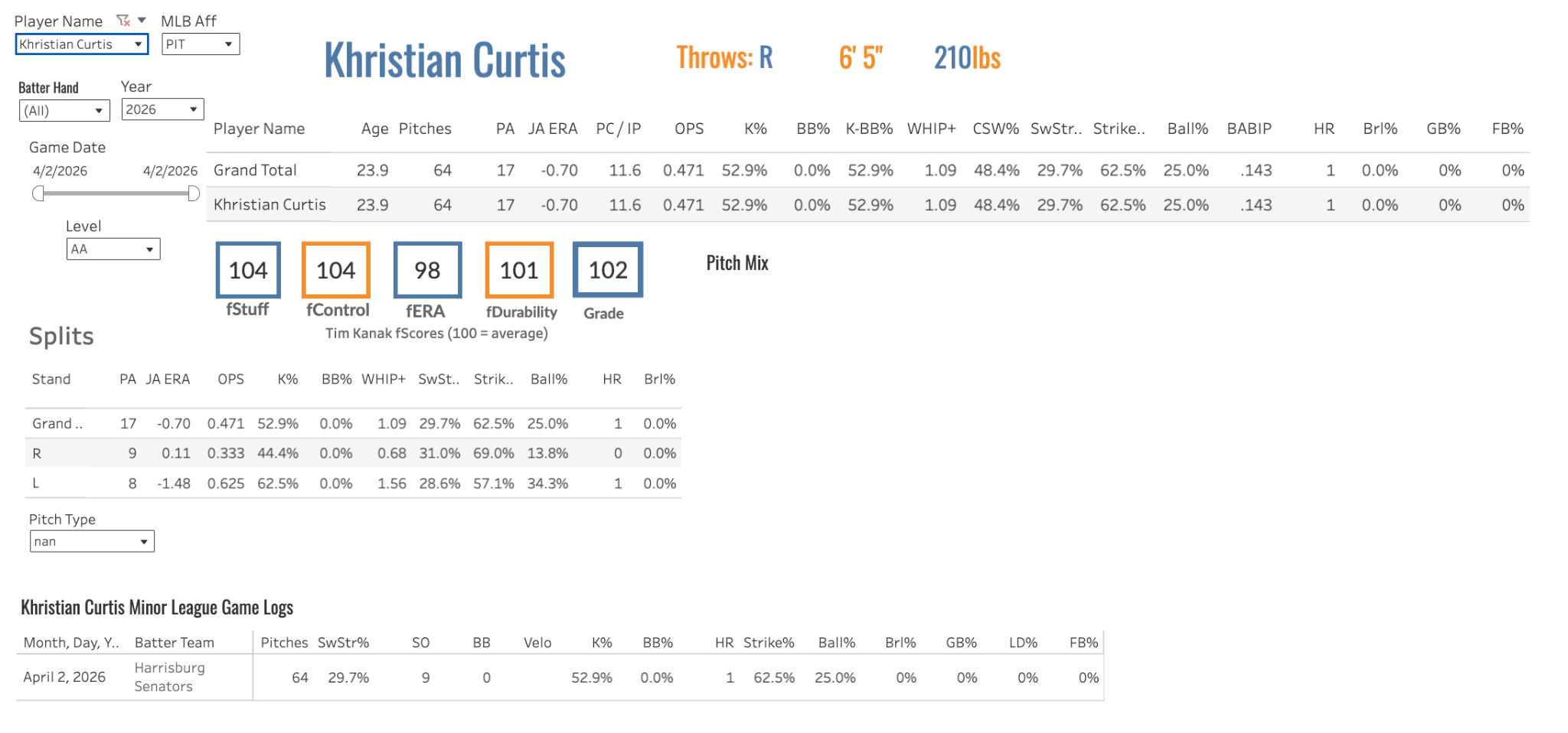 Prime Skills: Curtis wasn’t much on my radar last season and he seemed kind of destined to be a back end rotation guy, but that was before we had some pitch level data on him. This Spring, we got to see what he actually has in his arsenal and he’s a pretty over the top delivery guy with a fastball that touches up to 20” IVB at times and hits 97 on the gun and Trey Yesavage-like approach and arsenal with a dancing split change up, hard 12/6 cutter and a high velocity slider with above average extension.