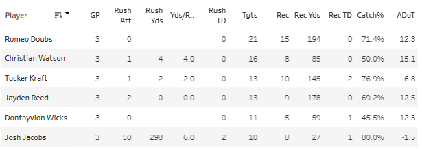 If I had to guess at one, it’s pretty obvious to take Romeo Doubs ($5,500). He leads the team in targets over these last three games and is affordable, but I don’t see any chance anybody looks optimal after we review all 11 games.