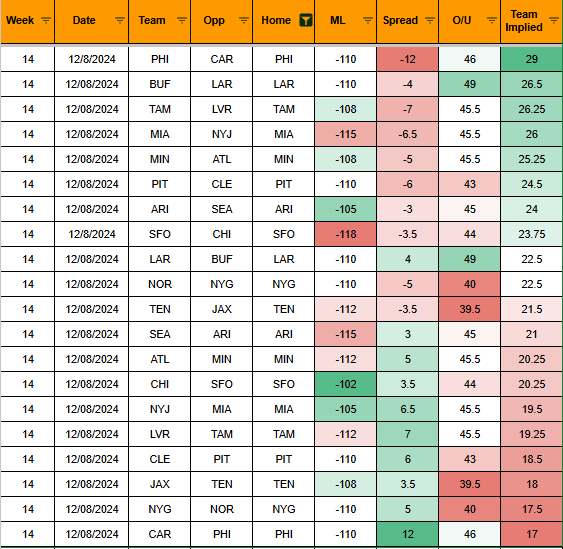 Spread: Eagles -12This is a dream spot for the Eagles. They are implied for 29 points, the highest on the slate. The Panthers have allowed the sixth-most fantasy points per snap this year and the fourth-most overall. Their biggest weakness is against running backs. They have allowed 370 fantasy points to opposing RBs this year, the most in the league, and they have allowed 4.85 yards per carry to RBs.