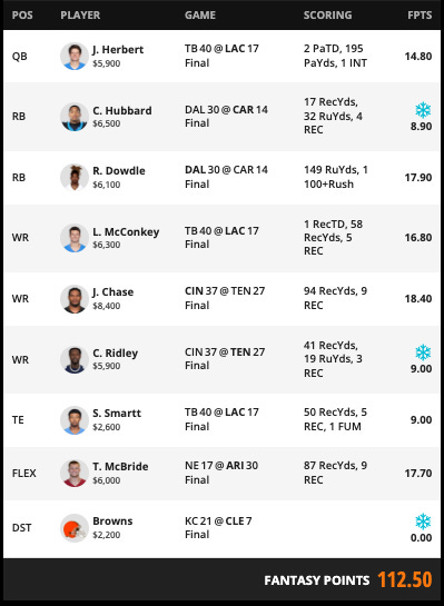 It was another bad week. I went with Chase instead of St. Brown and didn’t get a single 20+ performance. Bad stuff: