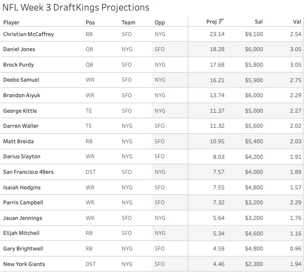 I break down Giants vs. 49ers, the Week 3 Thursday Night Football matchup - and provide the projection-powered optimal cash lineup.