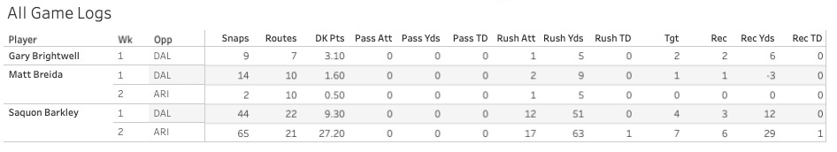 With Barkley out, it’s looking like Matt Breida will get the bulk of the work. Barkley averaged 15 carries and 5.5 targets in his first two games, last year averaging 18.5 carries and 4.8 targets per game.