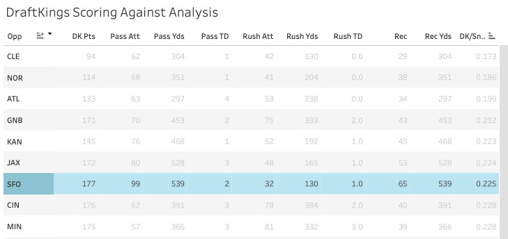 As we said, it’s a brutal spot against this defense. The 49ers were a top-10 DST last year, and this year so far they’ve allowed just 0.225 DraftKings points per snap, the 7th-best. It helps, of course, that one of those games was against a Steelers offense that doesn’t figure to be very good. The Rams were able to score 23 points against them and Matt Stafford went across 300 yards, so we don’t really know how it will play out this year - but the better bet would seem to be that this is a very good defense.