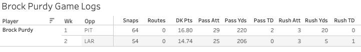 Two great games for Purdy, although without a big fantasy game yet just because he hasn’t been asked to do allt hat much with how efficient their offense has been. He is not a runner, so that keeps his floor and ceiling really low. The 49ers can have these games where they score 30 points without Purdy doing much of anything just because the running backs and defense do so much of the work.