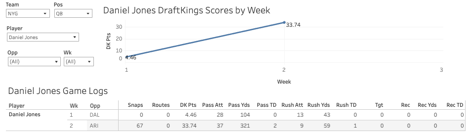 Danny Dimes has had one very bad game and one very good game (for fantasy purposes, at least). He had a huge second half last week to lead a big come back and showed a bit of his fantasy upside there with 321 pass yards, 59 rush yards, and three total touchdowns.