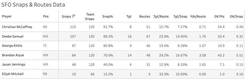 Brandon Aiyuk is a game-time decision tonight, which is annoying - but the projections assume he plays. If he is out, that’s a pretty big difference maker given that Aiyuk has 14 targets in two games, so that vacates a lot of usage.