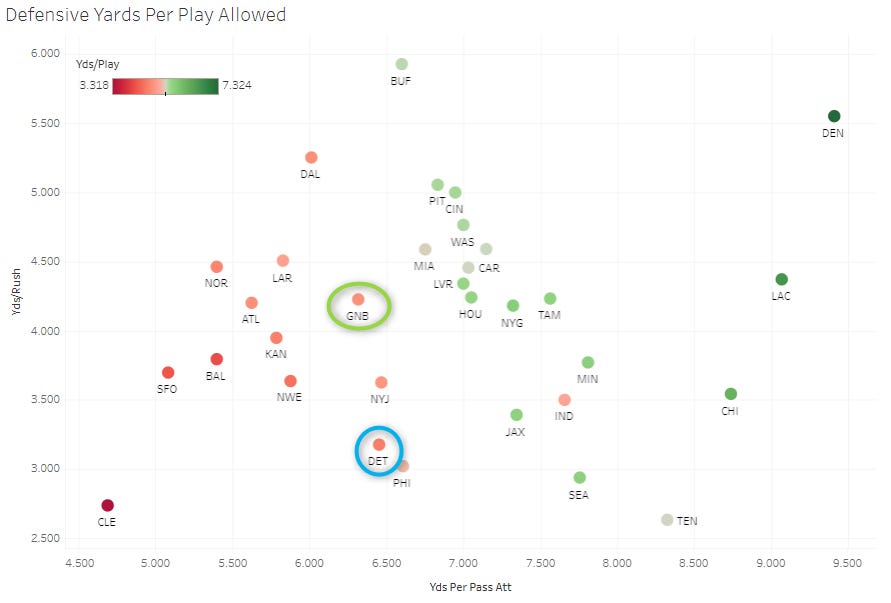 Both defenses are in the top ten in yards allowed per play. Green Bay has allowed 70 plays run against them per game, the sixth-most in the league - and Detroit is eight spots behind them at 64 plays. There’s still a lot of variance in those numbers with just three games in the books.