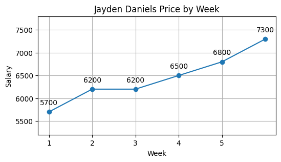On the other side is Jayden Daniels, who is second in QB points with 113.4. His price has been climbing all year and jumped a huge $500 for this game with the Ravens.