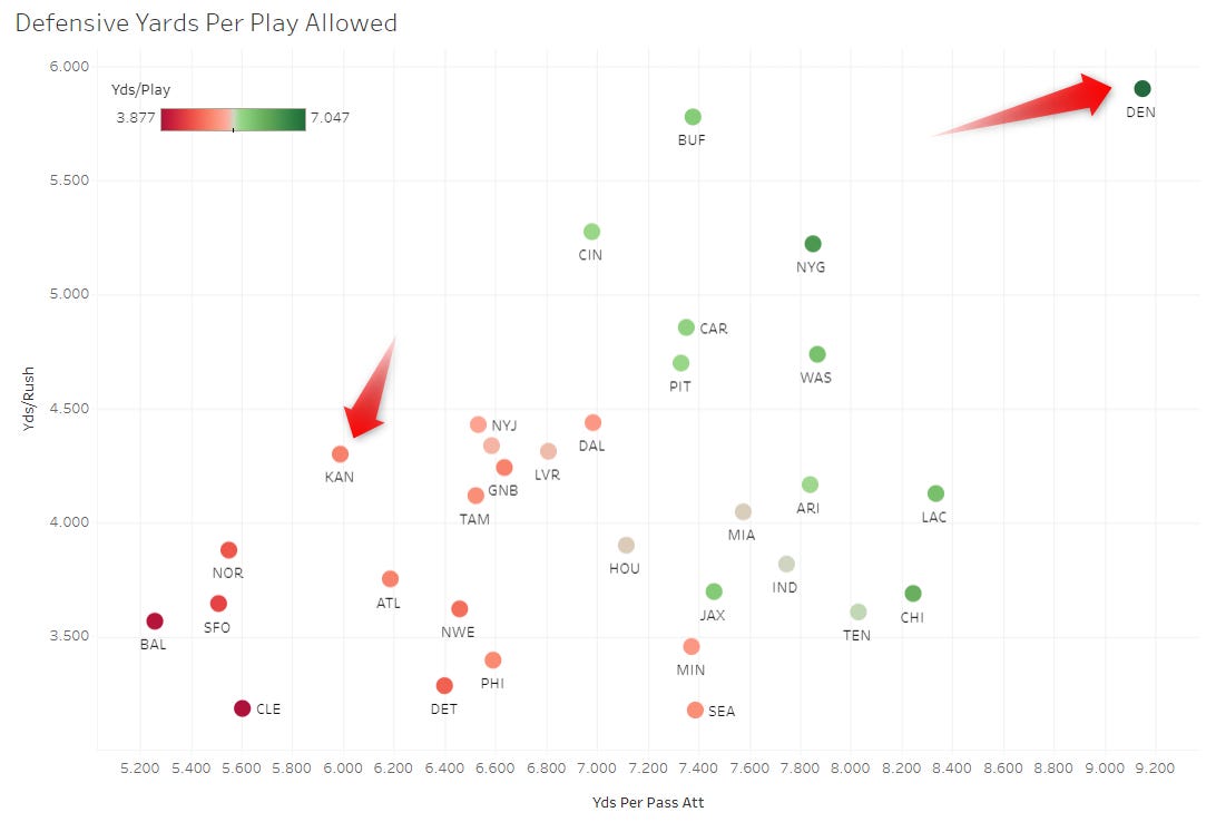 The Broncos have been the worst defense int he league, although a lot of that has to do with that outlier shellacking by the Dolphins. But even if you normalize that, their dot is still way up and to the left.