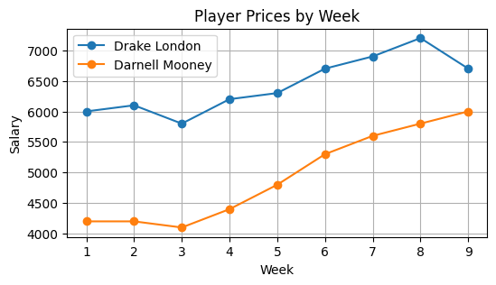→ Pitts 16% Tgt%, 18% TPRR, 7.8 ADoTDrake London ($6,700) and Darnell Mooney ($6,000) are the main guys. Mooney had the big game last week while London took a backseat, and that resulted in a $500 price reduction on London.