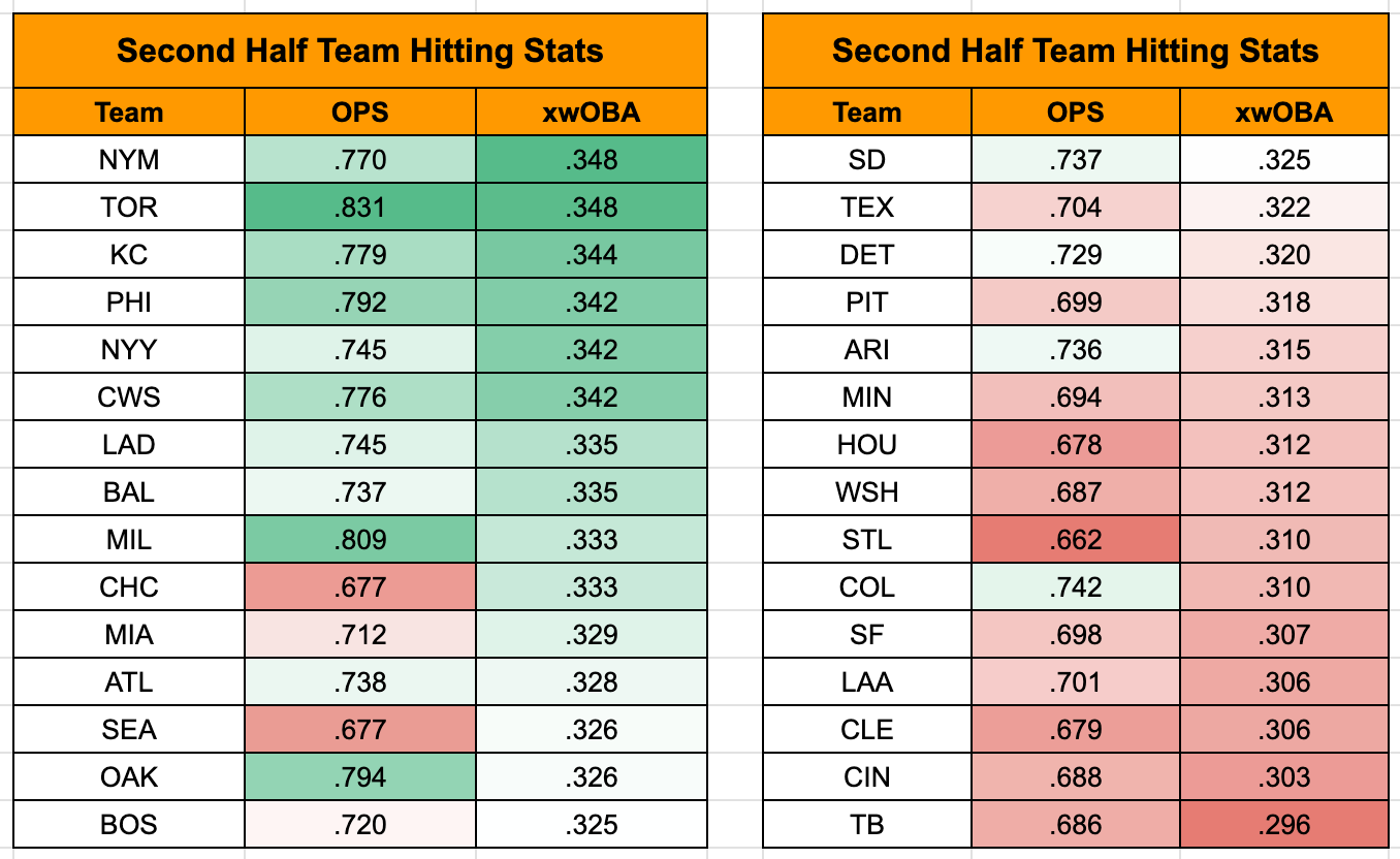 To reset our minds a bit on which matchups are good and bad, here are some key team hitting stats from the second half (July 16th and on).