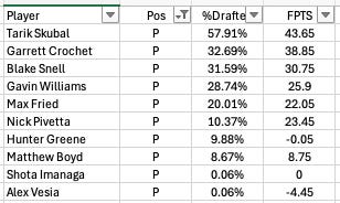 The model liked the Dodgers against Hunter Greene. The optimal SP combo was Skubal and Crochet, and they both went well above the rst of the SP field for 44 and 39 points respectively.