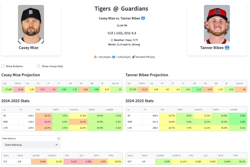 We start with Mize against Bibee. Quite a large step backward from Skubal vs. Williams.