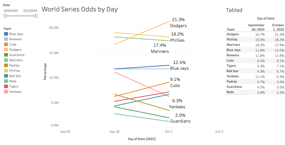 The line plots are always ugly until you have 5+ data points. So the Phillies went from 19% to 18% without even playing a game. The Dodgers are now the favorite, leaping the Phililes and Mariners with their game one win. The books and bettors clearly think they are truly the best team, they just had the disadvantage of having to win two games to advance.
