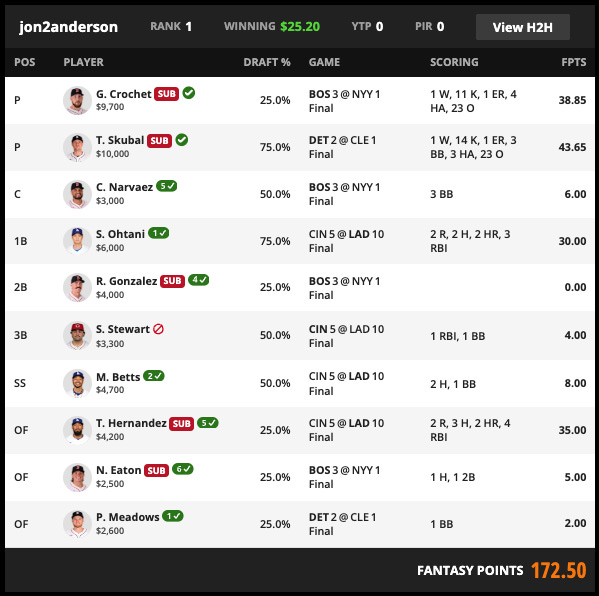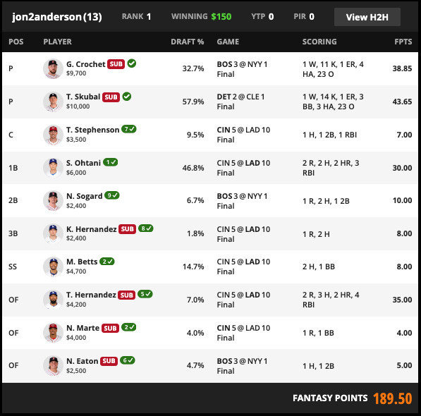 I didn’t even bother to change Sal Stewart to another player after the Reds lineup came out, but that probably worked out for the best. This lineup was 5th in the $5 Hundo (5/100) and it landed 13th of 400 in the double up I played.